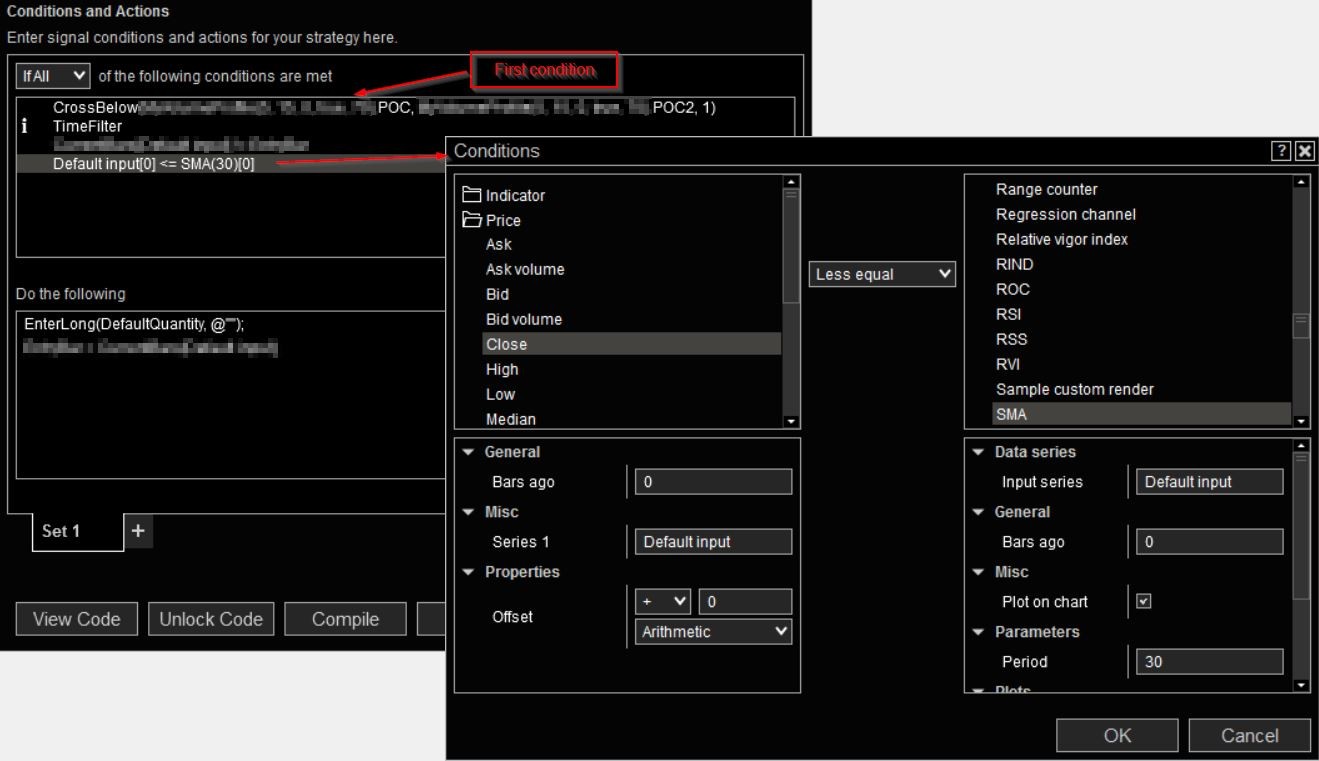 ...and for this, I use the SMA with period 30 as "Moving Average", so how can I say on the strategy builder with two conditions: