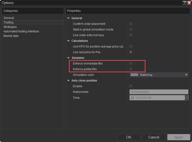 That's not a clear as it could be.Originally posted by NinjaTrader_BrandonH View PostSince we cannot control how orders are handled once they leave NinjaTrader in a live scenario, we do not have an option to avoid partial fills for the simulation account.