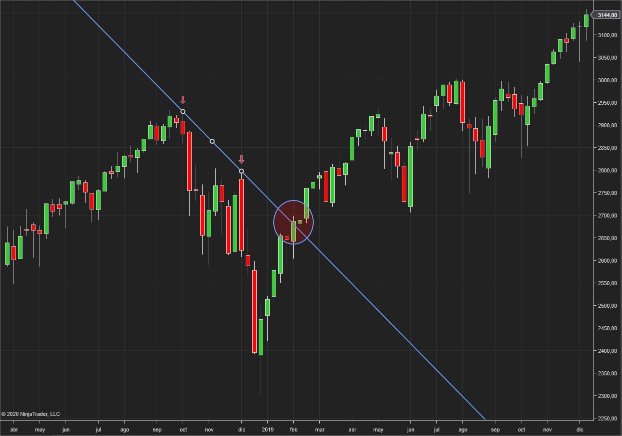 To clarify, I attach an image with the example. In the image you can see how the extended line is drawn based on the two points marked with the red arrows. And what I want to detect is what I mark with the red circle. That is, I want to detect when the price breaks the line drawn.