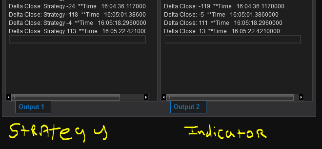 In the output window the strategy has the same time stamp as the indicator but the DeltaClose value matches the previous indicator value.