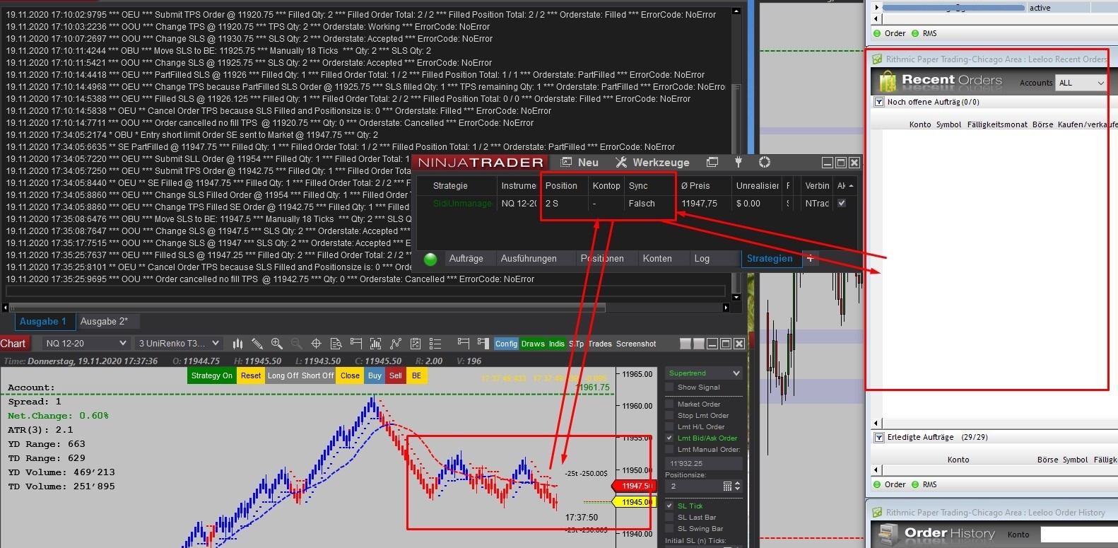 Hi _Jim, "Unmanaged does not have internal rules and is not tied to the internal Strategy Position." if i understand this correctly, the synchronization in unmanaged mode has no relevance for the strategy and there is no synchronization, right? the strategy can also send orders without being synchronized (position vs. account position). then the strategy as shown on the picture (not synchronous) can still send orders, right? the orders should all be maintained via the OrderUpdates (), because I use Rhitmic.