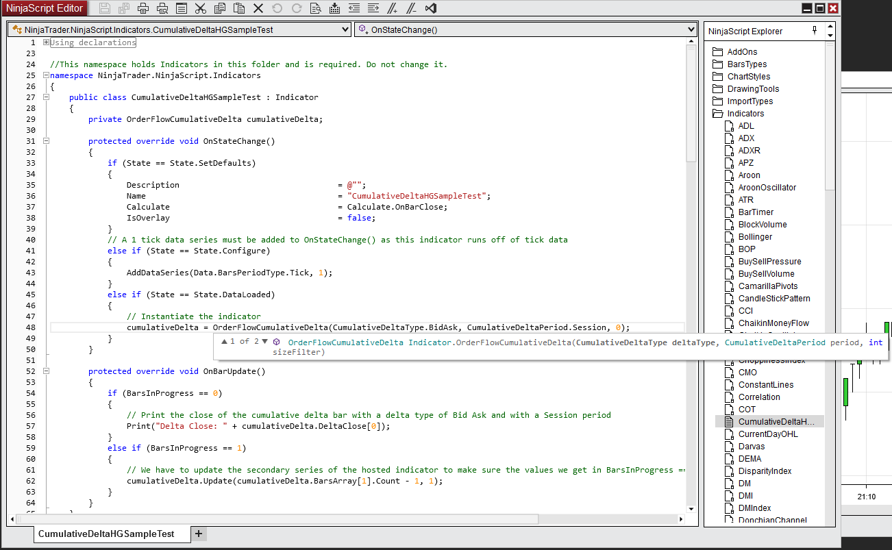 I went to the definition for the OrderFlowCumulativeDelta class in VisualStudio, and there are no implementations, like it's just an interface. I'm working inside of the NinjaTrader.Custom solution. Is there a particular library that I need to download when working with these order flow indicators?