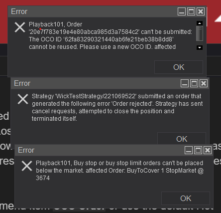 I do not understand if the errors are causing one another or not. I had Buy stop or buys stop limit order solved in the past by updating to the latest NinjaTrader8 version but the OCO one is new.