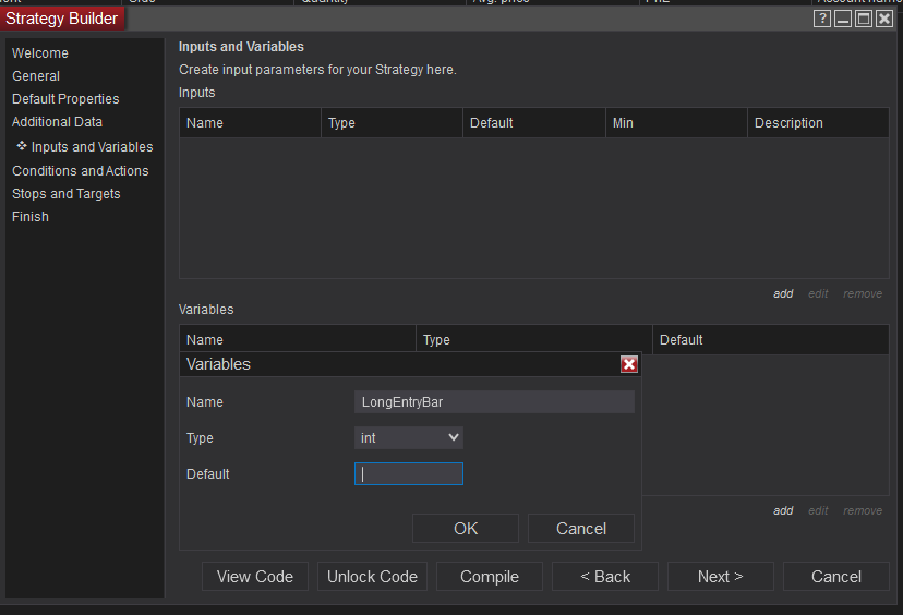In Post #15 you said: “In addition, you will need to create an int variable in the inputs and variables section, call it LongEntryBar (or whatever you like).” So …, this goes under ‘variables’ within the ‘Input and Variables’ section – am I right? What 'Default' value do I assign it and what do I consider in assigning it any value? See attached.