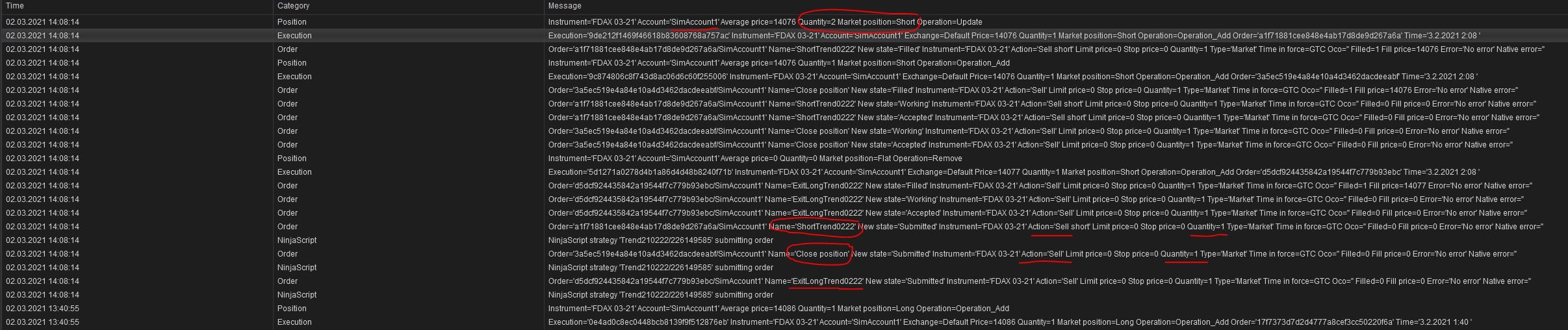 As I allowed only 1 entry per direction, I suspect an overlap between Exiting a long and Entering a short, leading to the effect that NT tried to close a long position itself before entering a short by the strategy, although the strategy has met set 2 (exit Long) before itself.