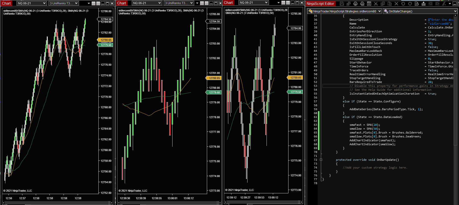 smaFast = SMA(20); smaSlow = SMA(50); smaFast.Plots[0].Brush = Brushes.Goldenrod; smaSlow.Plots[0].Brush = Brushes.SeaGreen; AddChartIndicator(smaFast); AddChartIndicator(smaSlow);
