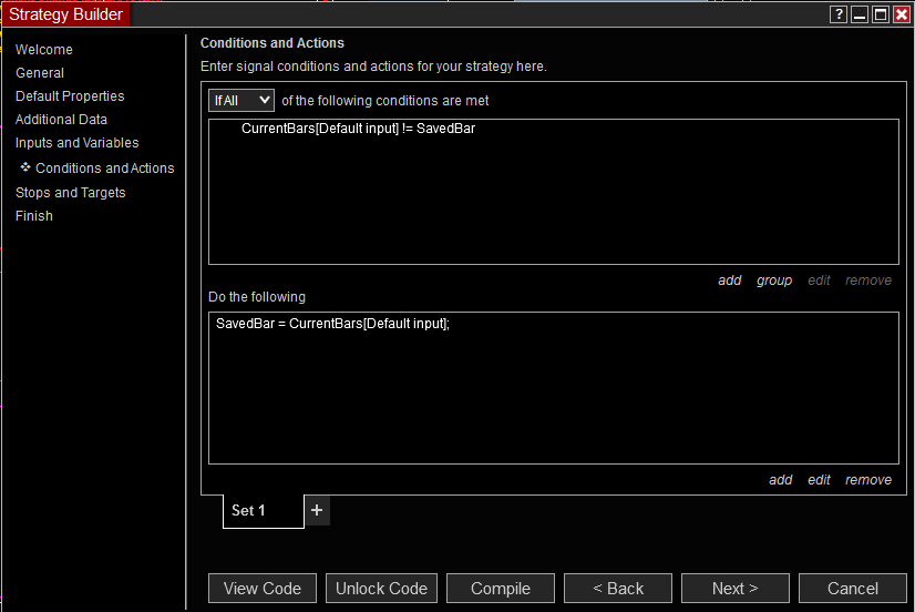 You will need to create a variable in the Variables section of the "inputs and Variables" window of the Strategy Builder. It should be an integer (int) type you can name as you wish but for this example, I will call it Savedbar.