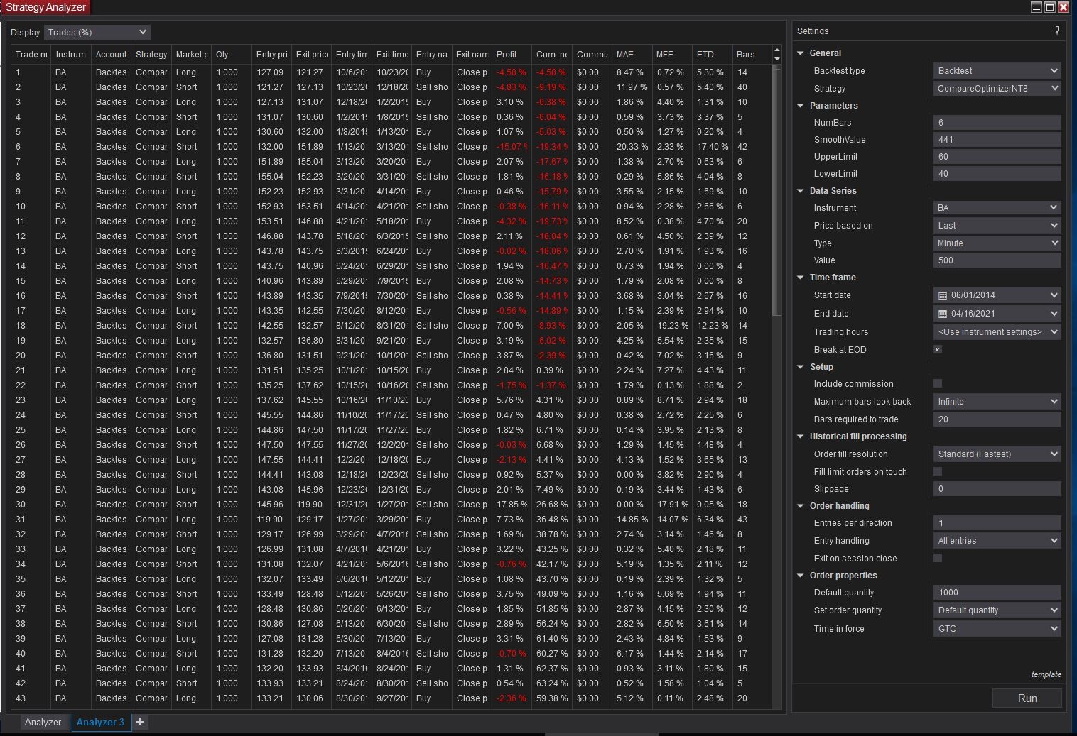 To make sure that I did not set the wrong settings in the panel I took the parameters obtained in NT7 and copied them in the NT8 settings panel. As you can see in this case, results are identical with an irrelevant difference in profits (NT7 Results in NT8 1.JPG, NT7 Results in NT8 2.JPG).