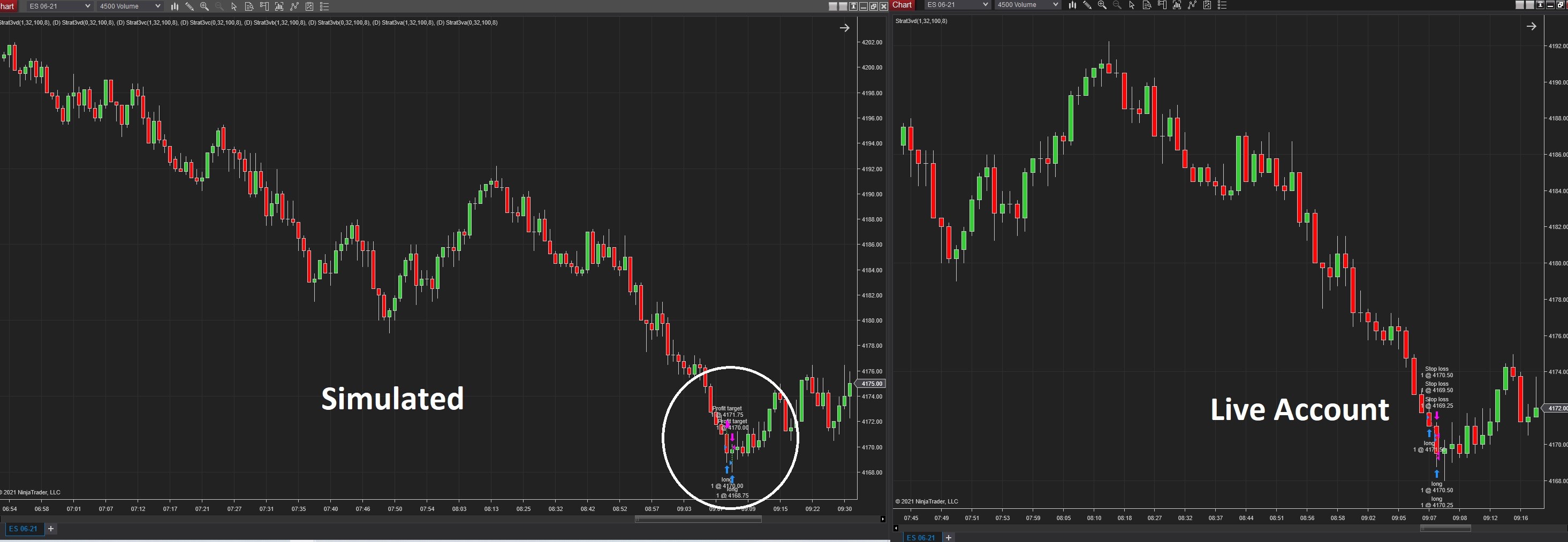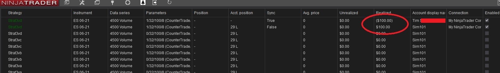 During the live market during the day, I'm running one strategy on a chart for simulation trading. Then, I'm running that excat same strategy, on the same chart, with the same parameters, on my live account. That is, the only difference between these two is the sim account vs. live account. But, as you can see, the sim account ended up $100 for the day, while the live account ended up at ($100). Of course, I'd rather have the $100 than the ($100)!
