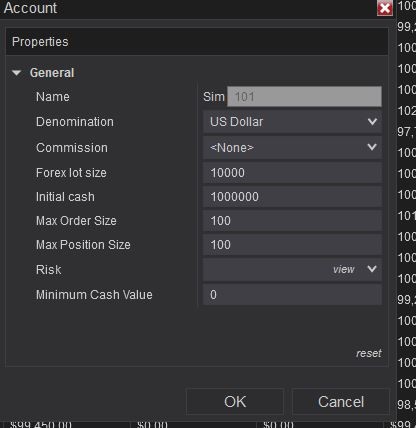 Entries per direction is 5, max positions in SIM101 is 100, and 1,000,000 is the cash in the account.