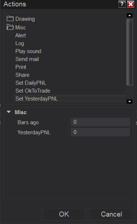 Set 2 - Condition is FirstBarOfSession, Actions: Pull in RealizedPNL into YesterdaysPNL, Prints on the chart the value of both dailyPNL and TotalPNL, reset dailyPNL to 0, resets OktoTrade to true