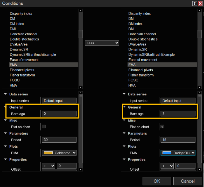 To check for the value of the 15-period EMA 3 bars ago, you would set a 'Bars ago' value of 3 for the 15-period EMA indicator when creating your condition.