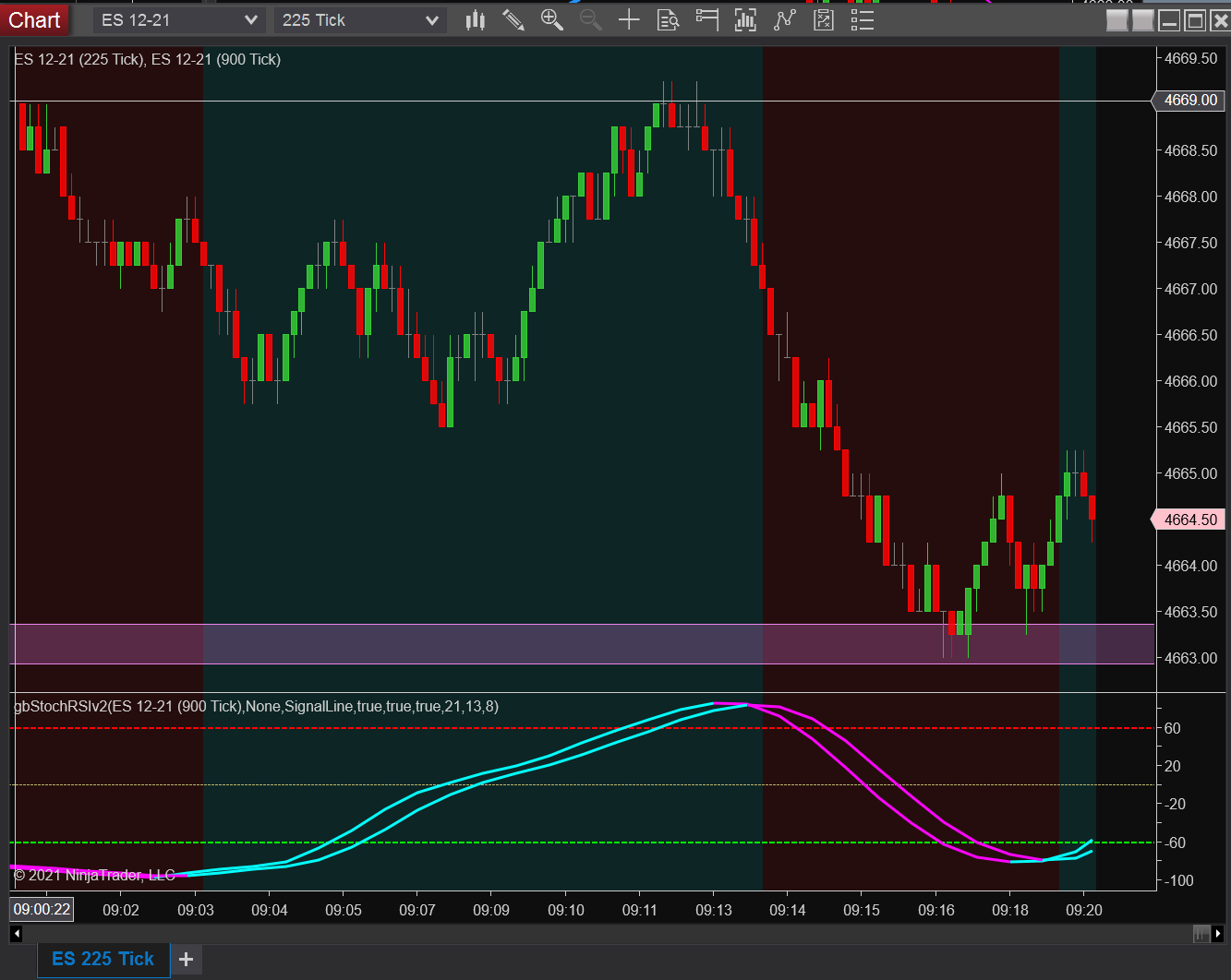 The strategy is a rising 900 tick RSI where plots the background of an 255 tick chart.
