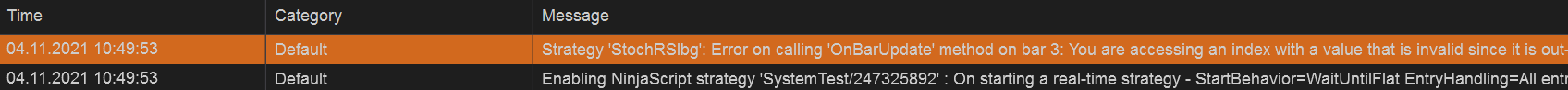 Hello Paul, This is what I get: Error on calling 'OnBarUpdate' method on bar 62: You are accessing an index with a value that is invalid since it is out-of-range. I.E. accessing a series [barsAgo] with a value of 5 when there are only 4 bars on the chart.