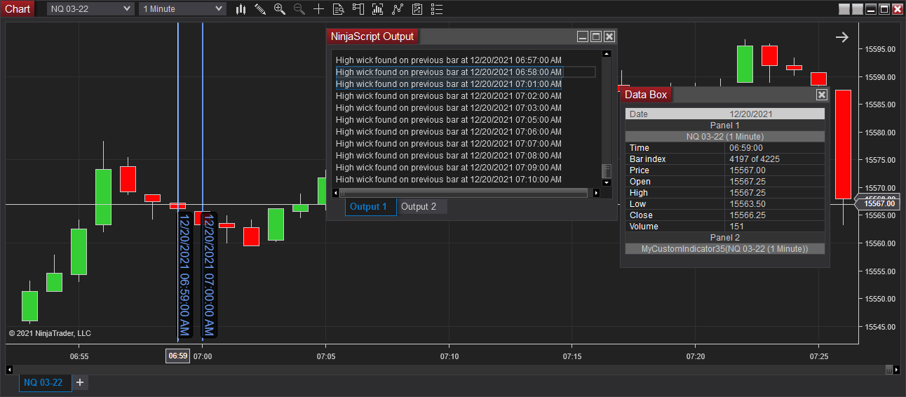 Working with Price Series - https://ninjatrader.com/support/help...ice_series.htmCode:if ((High[1] > Open[1] && Open[1] > Close[1]) || (High[1] > Close[1] && Close[1] > Open[1])) Print("High wick found on previous bar at" + Time[0])