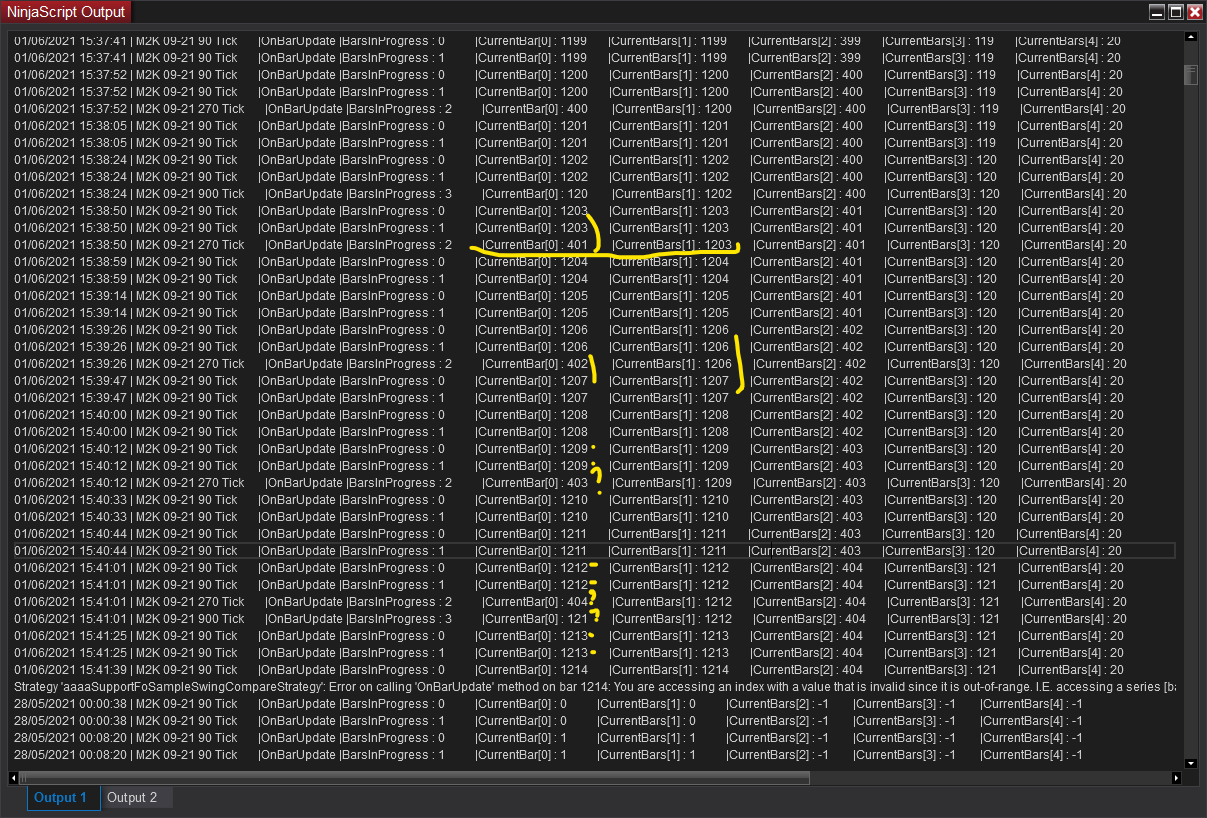 Also in the output, we marked in yellow some strange occurence : when BiP is 2, CurrentBars[0] is less than whan it was BiP 1...