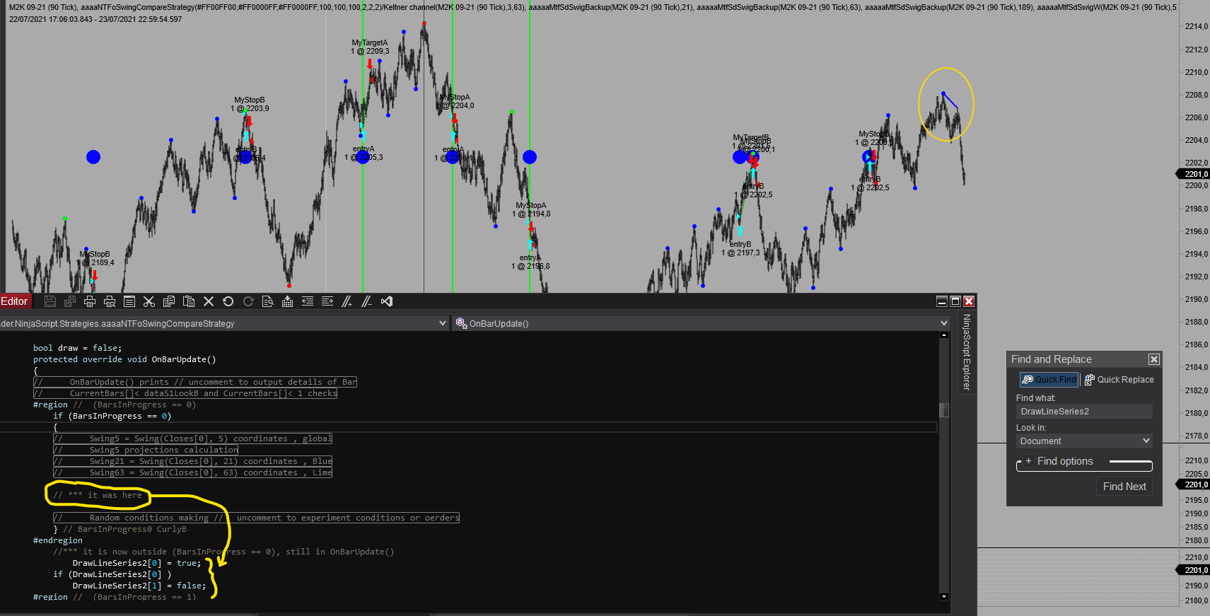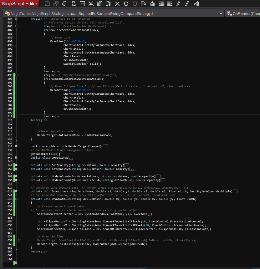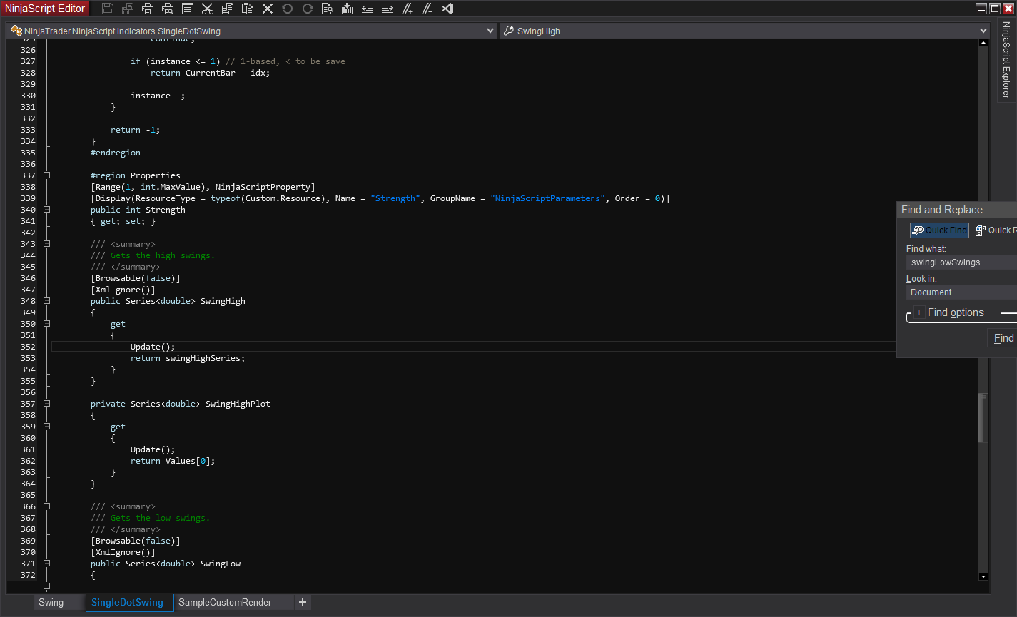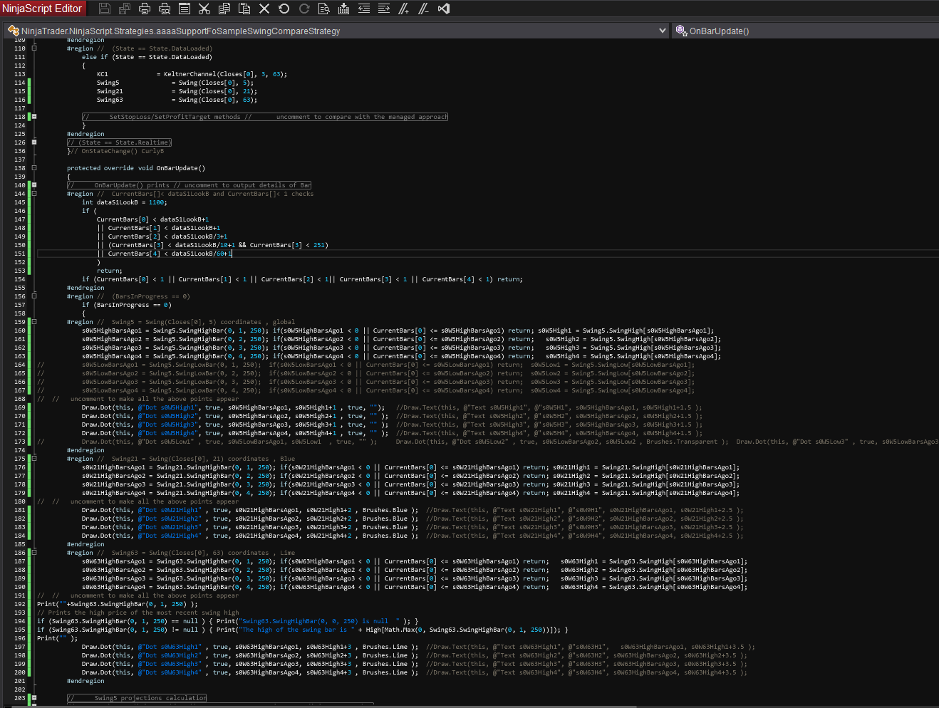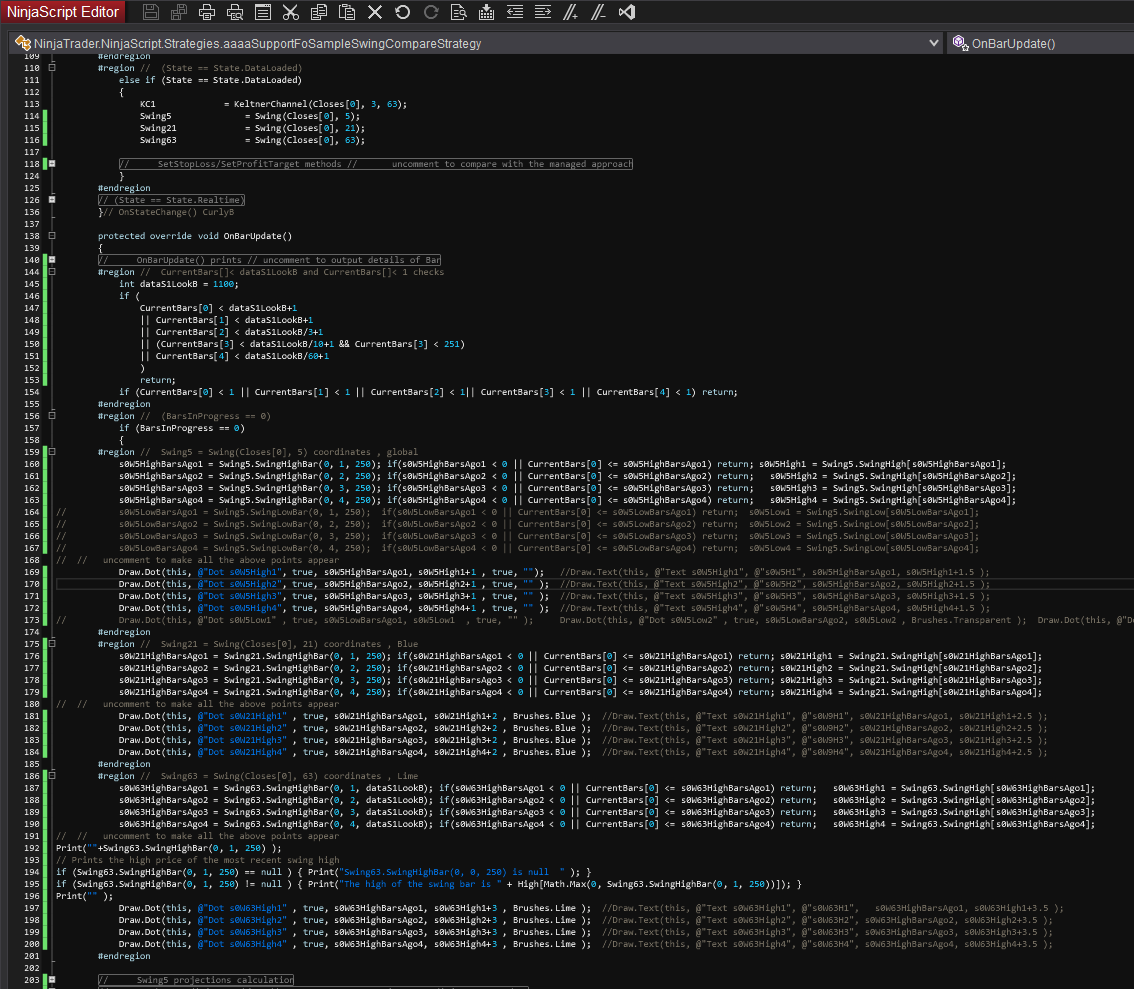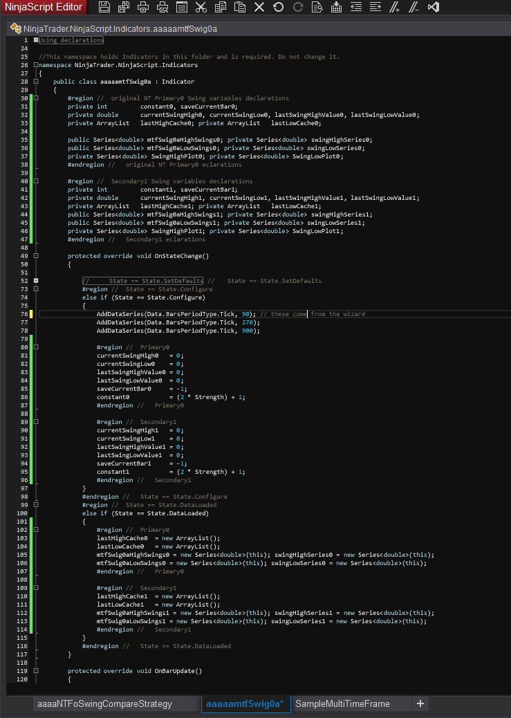 The variables used are from the (BarsInProgress == 1) (90 ticks) calculation of the swing, and the added Functions.