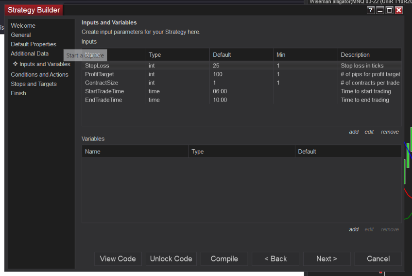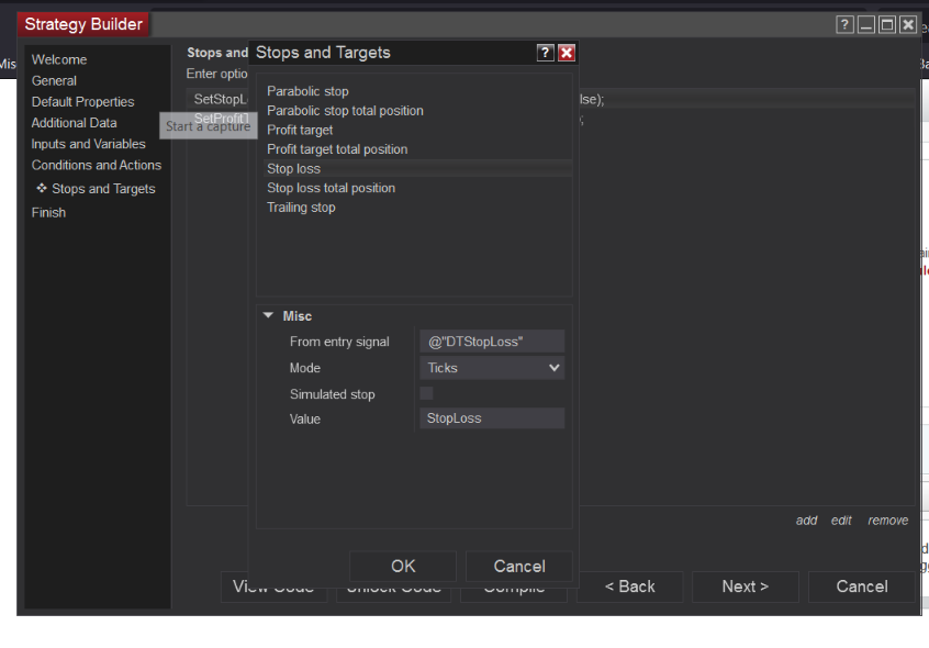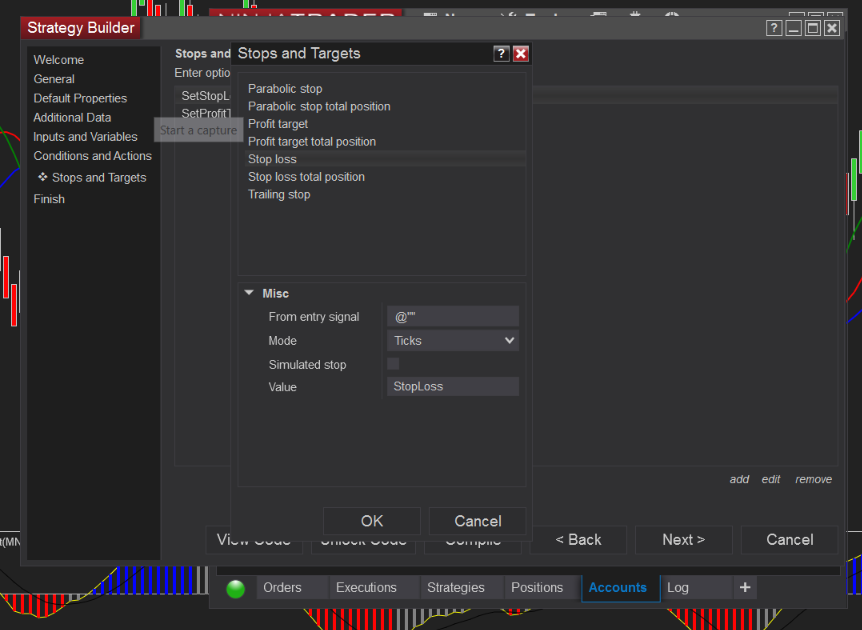 Ok I have built the entire strategy, thank you, Kate W. for your help. However, I am having issues with my stop loss and take profit. So I have a take profit and stop loss in the "inputs" section and they are referenced in the "stops and targets" section. However, when a trade is taken, no stop loss or take profit is triggered. Please see attached pics. Can you please advise?