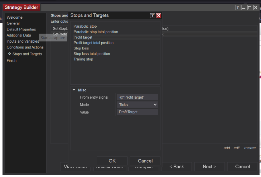 A simple trailing stop (which will trail by 1 tick for each tick in profit starting from a defined offset from the entry price) may be set on the Stops and Targets screen, as may a profit target. I'm attaching a simple example below.