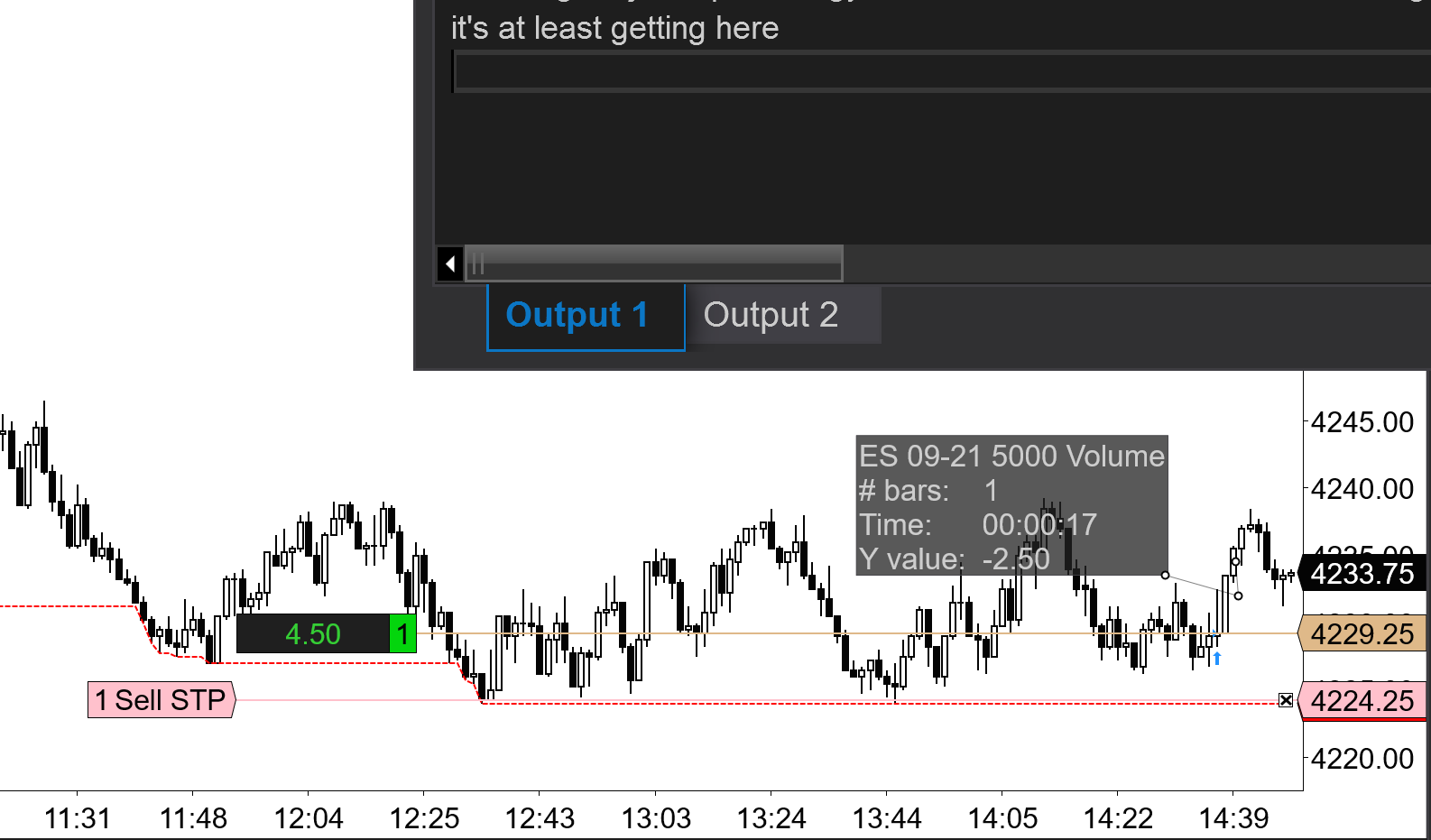 For the couple of hours I've been trying to get the stop loss to trail behind bars that close in favor of the position. For example if long then wait for an up bar. Once an up bar closes, update the price of the stop loss to a new price below the recently close up bar. There is a user input called stopBufferTicks that controls how far below the recently closed up bar the new stop is to be placed.