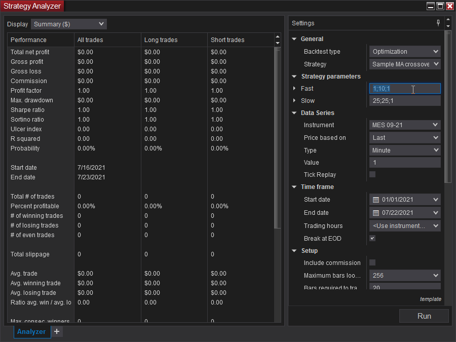 When I try to run Optimization in the Strategy Analyzer, I get an Error message "The strategy must have at least one parameter to optimize". I tried to do everything possible but unable to figure out the issue. I will appreciate any advise you have.