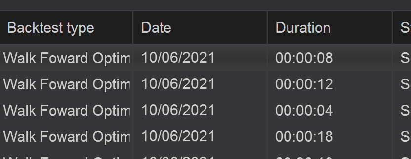 The Duration column in the Strategy Analyzer refers to the amount of time taken to run the backtest/optimization of a strategy.