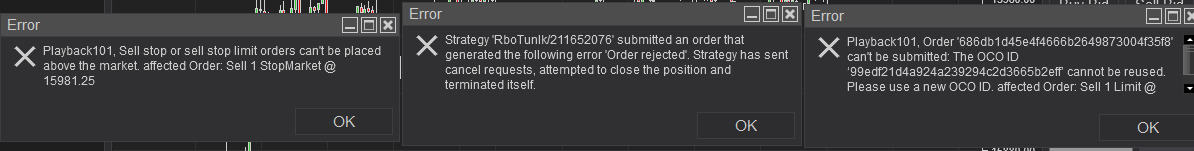 The 3rd error message: PlayBac101, Order686db1d45e5.... can't be submitted: The OCO ID '99edf21d4a23....' cannot be reused. Please use a new OCO ID. affected Order: Sell 1 Limit @