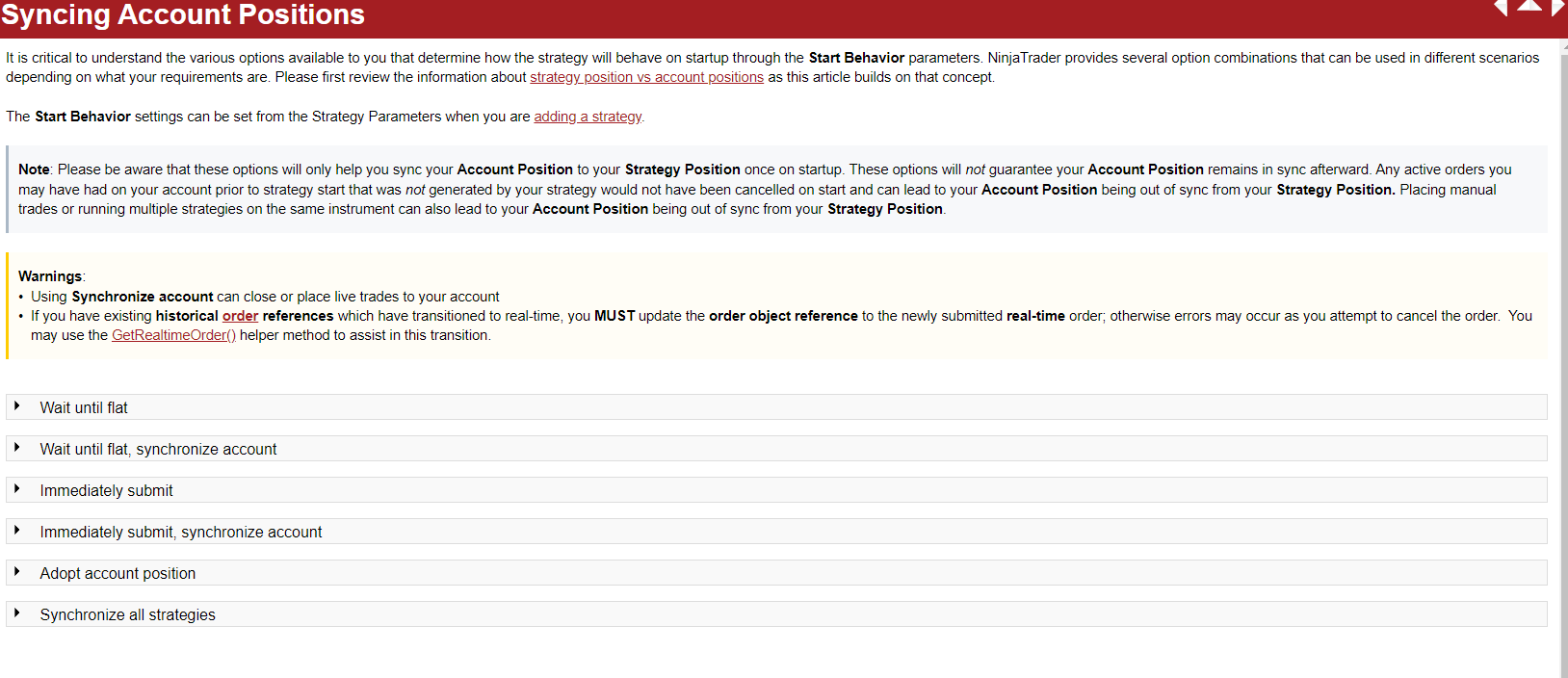 This one deals with strategy start behavior: https://ninjatrader.com/support/help...g_account_posi tions.htm Wait until flat is the default.