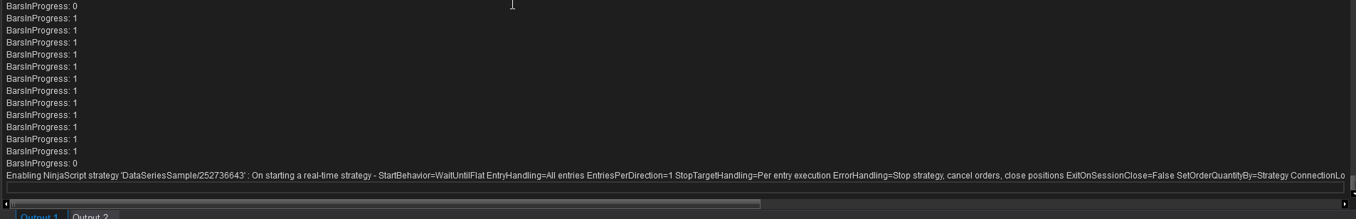 Enabling NinjaScript strategy 'DataSeriesSample/252736643' : On starting a real-time strategy - StartBehavior=WaitUntilFlat EntryHandling=All entries EntriesPerDirection=1 StopTargetHandling=Per entry execution ErrorHandling=Stop strategy, cancel orders, close positions ExitOnSessionClose=False SetOrderQuantityBy=Strategy ConnectionLossHandling=Recalculate DisconnectDelaySeconds=10 CancelEntriesOnStrategyDisable=False CancelExitsOnStrategyDisable=False Calculate=On price change IsUnmanaged=False MaxRestarts=4 in 5 minutes