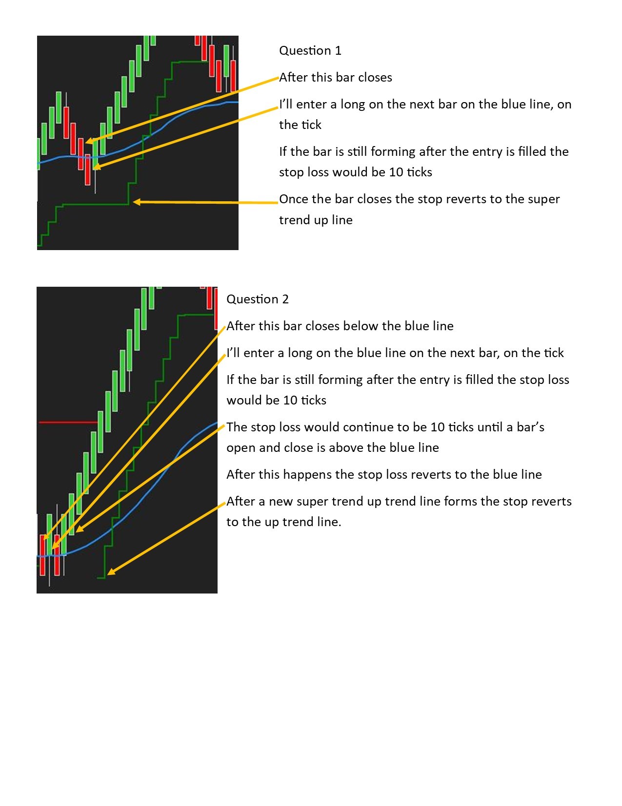Question 1) Set a stop loss at 10 ticks on the entry bar and then switch the stop loss to the super trend up trend line after the entry bar closes, and;