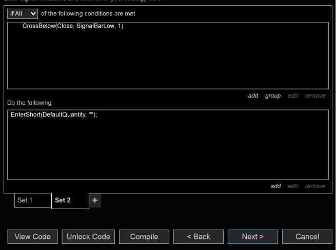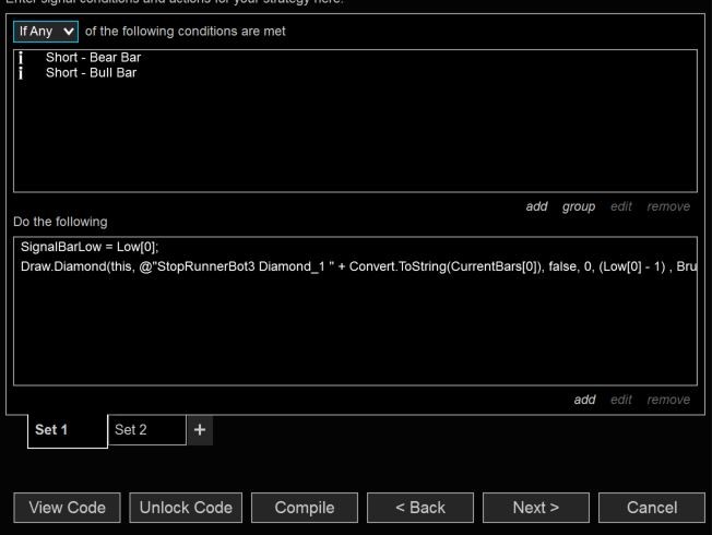 Set 2 contains no conditions so it will run on each OnBarUpdate(). Set 2 will copy the previous value of “myCounter” to bring it to the current bar [0] index. Set 2 will also copy the current bar number into CurrentBarCounter (again this is needed because you cannot do math on the system variable CurrentBar.