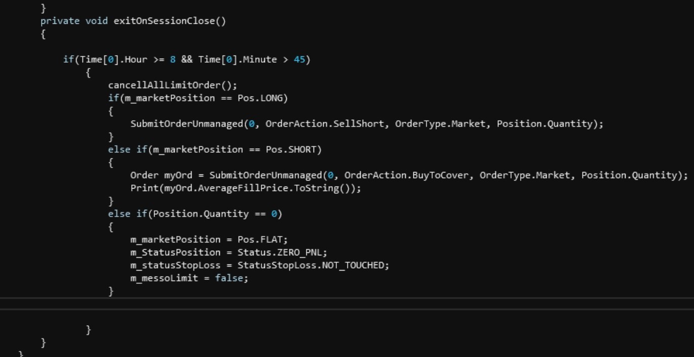 Hi, i'm trying to close the position with unmanaged apporach, but i don't get why it closes just half of my position and then shut down the strategy. I developed my own exitonsessionclosed() like in the photo. the fun thing is that in the output method I have 'disabling strategy ecc..' and then I have after the disabled strategy the Print() of the order average price. Thta i printed just to check if there were error in the order, what should it be? thanks