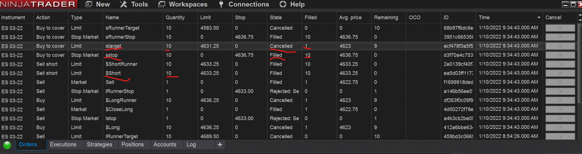 In Playback, I have placed Short order for 10 quantity with signal name "$Short" and all 10 got filled. I placed stop loss order (sstop) and target order(starget) for the same. Stop loss order got filled for 10 quantity. I am expecting target order has to be cancelled for all 10 quantity. But What I observed is, 1 got filled on target and 9 got cancelled. This is not expected right ? What cases it would be like this. There one long position opened due to this. How to handle this ?
