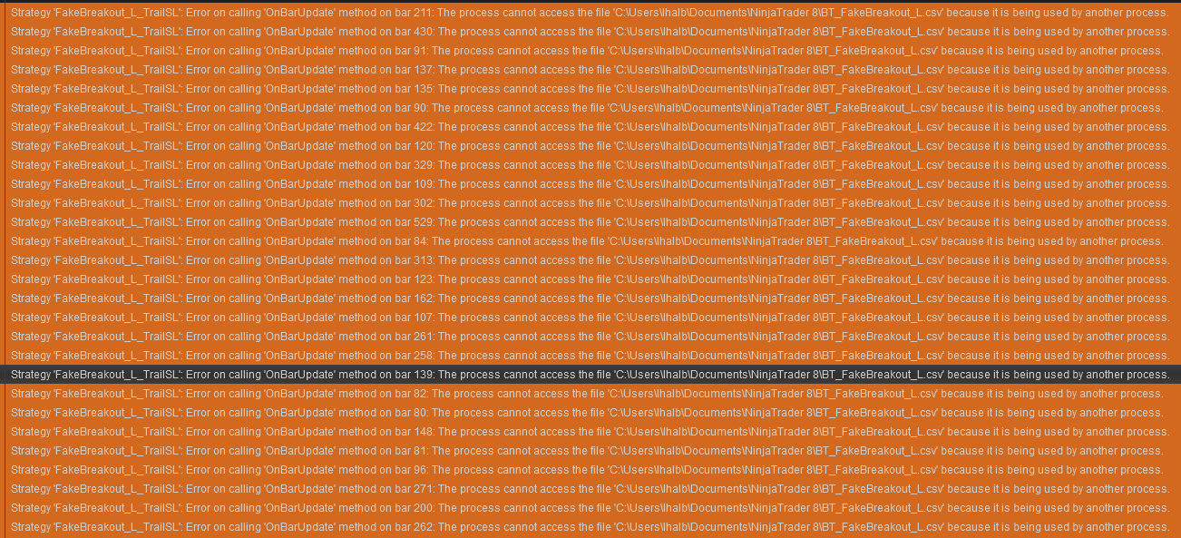 The best solution for avoiding file errors would be to not use a file for storing the data but store the data in memory then export it later after the test is done. That could be achieved using an addon and C# static objects. A simple example would be to create an addon with a UI which has 1 button, the action of the button would be to save the collected data. In the addons class you could have a static variable which your strategies add the strings to.