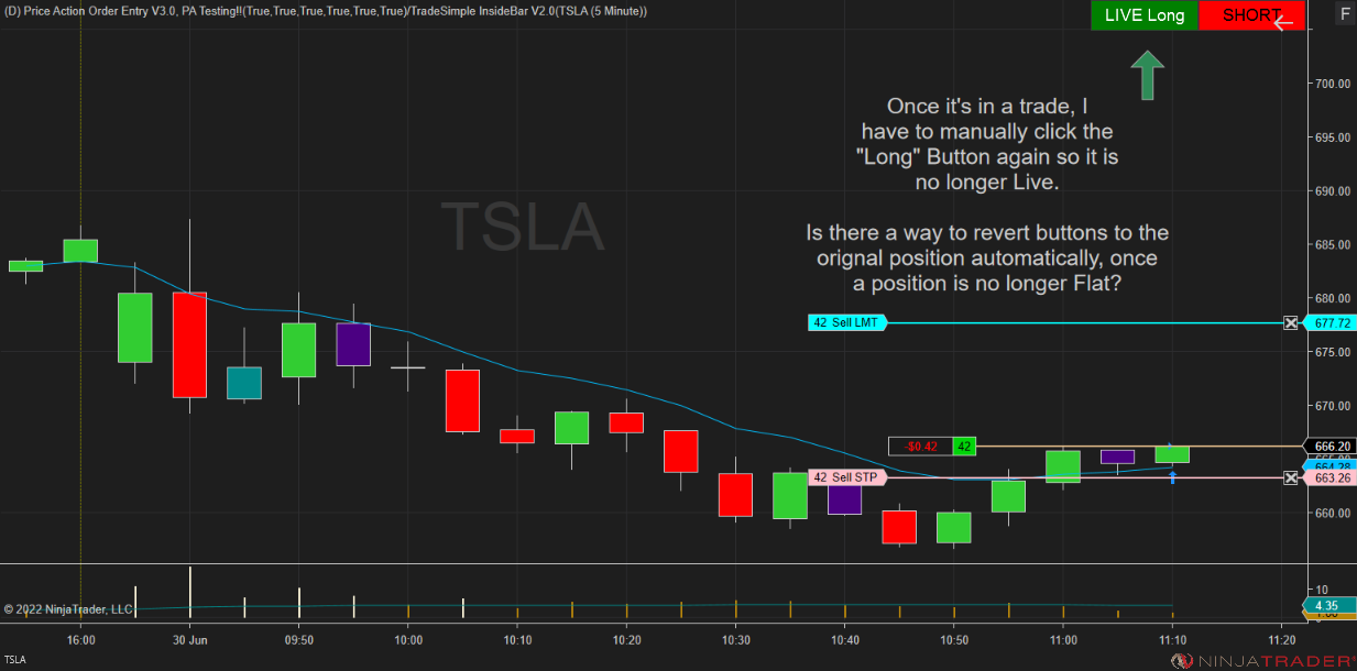 Right now the button, once clicked. Stays live until it is manually clicked again. I'm trying to figure out a way to automatically revert the button back to the "Non-Live" Position once my account is no longer flat/ in a trade(3rd Picture)