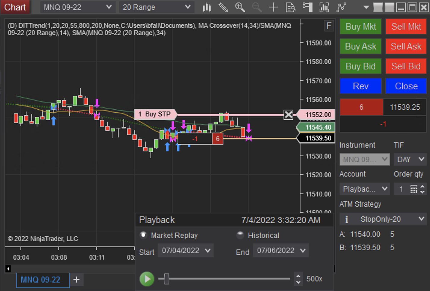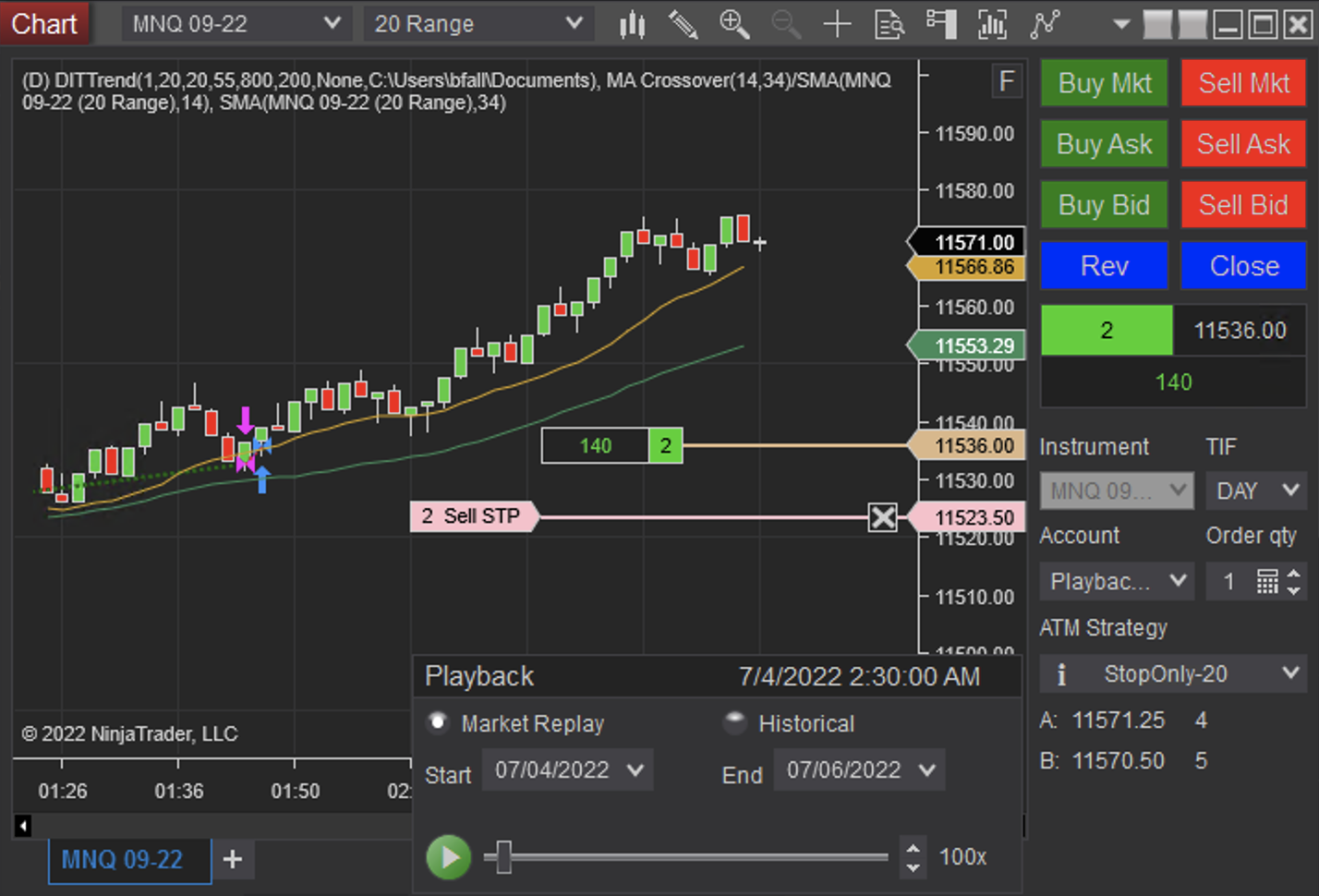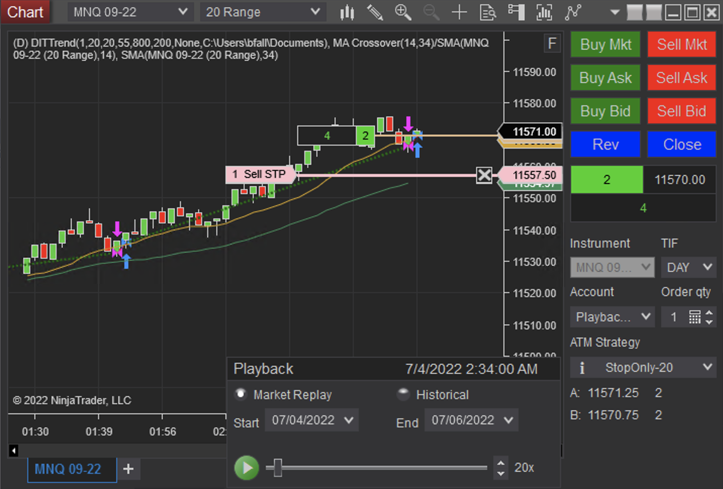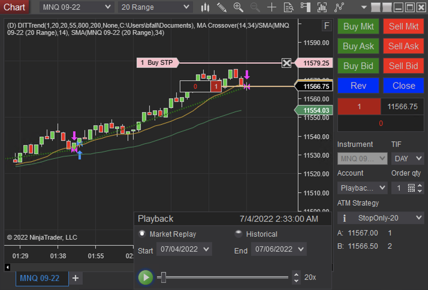 Play at high speed until about 02:33 AM EST, see all orders and stops match in count.