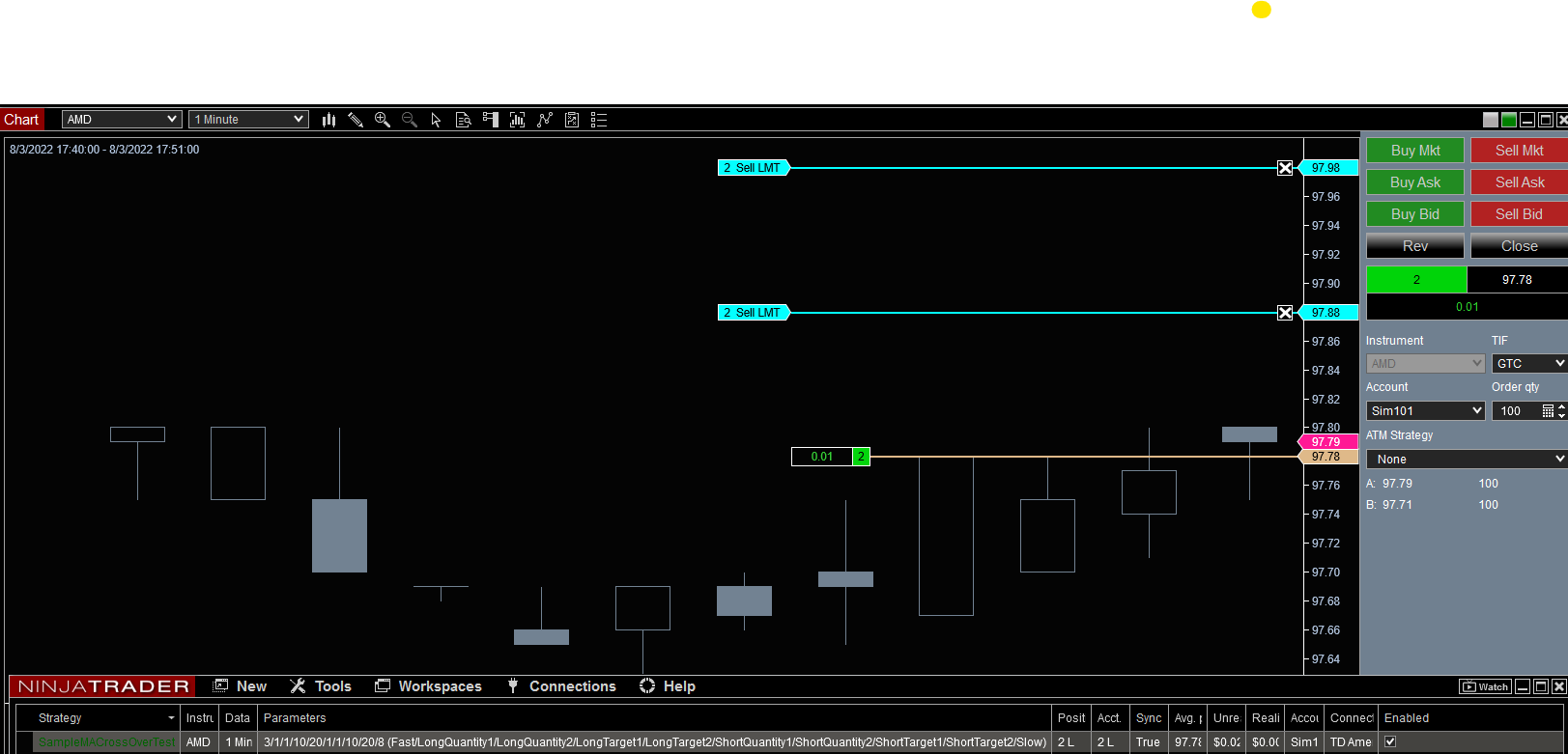 • If I connect to the TDAMERITRADE data, the problem begins. The orders will submit, but within a few seconds, each limit order DOUBLES, and my position remains 2.