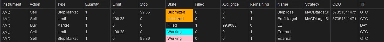 The stoploss was reached and there was a pending stoploss order "1S", the strategy desynchronized and did not generated a new trade after a few candles. In TOS everything ran fine. The oco, and the cancellation of the profit target.