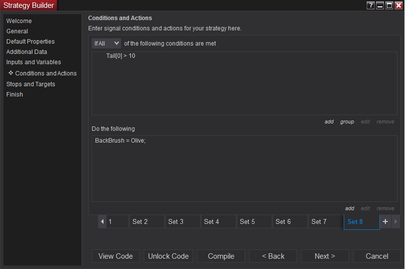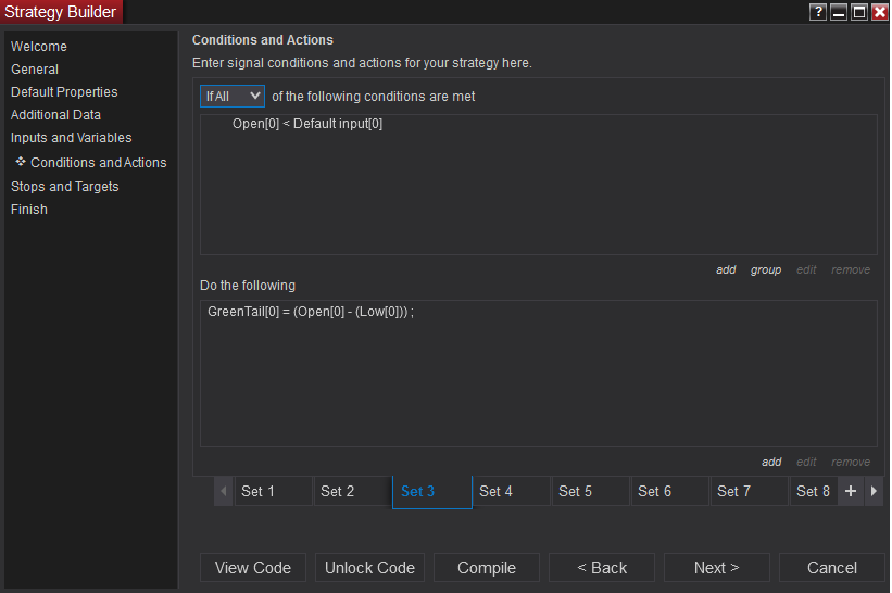 If you wanted to do this in unlocked code you can click the unlock button or view code to view the generated C# code. If you find that the code is not working as you expected you would need to identify on those bars why the condition became true so that you can adjust it as needed.