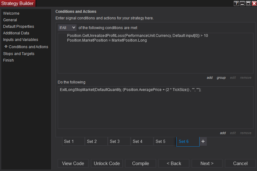 Or, you could use Exit methods, such as ExitLongLimit() and ExitLongStopLimit(), to place stop loss and profit target orders. You could see the example scripts in the forum thread linked below for an example of Strategy Builder breakeven and Strategy Builder trailing stop.