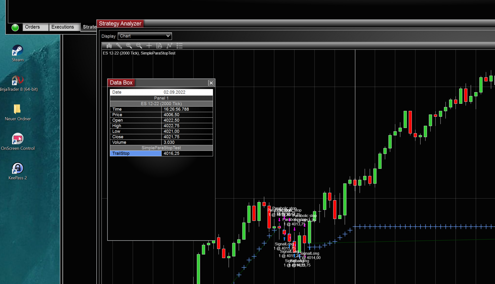 no need to reduce it. As said, it's a dead simple strategy. I have moved the SetParabolicStop to the "Configure" section in the code to make sure there is no race condition between "Position.MarketPosition != MarketPosition.Flat" and my intended dynamic parabolic stop with calculated ticks offset.