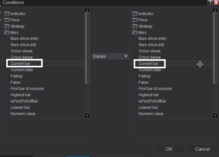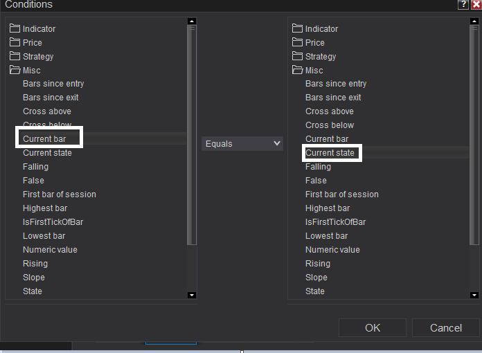 The pivotal item here to adjust would have to be under the Misc to Misc? Like instead of Current State Equals State is Real Time rather make it Current State Equals Current Bar since I want a bull bar to be the current state to trigger.