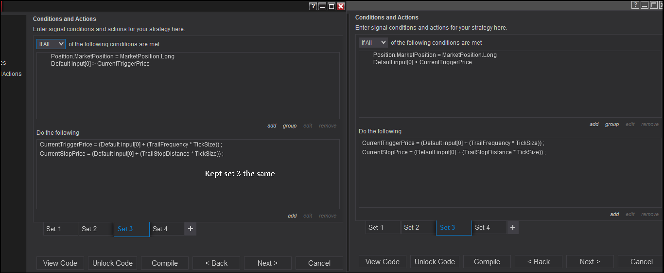 The reason I came back to just that trailing stop example was because the stop kept moving away from price on me & back down into negative territory instead of just being stopped out with a small profit or small loss. I assumed I got too complicated with my 22-set strategy & noticed that the example one that I had was doing the same thing, so I re-downloaded it & the stop worked properly. So, I wanted to keep that simple trailing behind price idea & add a set of conditions.