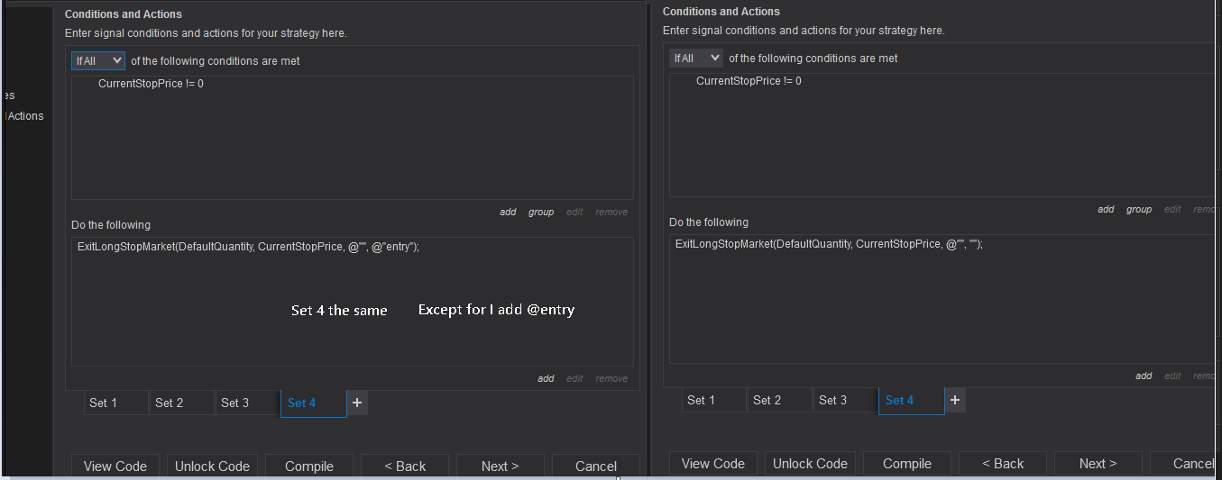 I believe it would be best to go back to the basics here and make sure you fully understand what that trailing sample is doing before moving forward. The key take away is that your last set uses variables to keep the order active while unfilled. This is required because of the custom calculated price that is being used. The otherr sets also use varaibles to dictate when to change the stop price and what frequency that stop is modified.I assumed I got too complicated with my 22-set strategy & noticed that the example one that I had was doing the same thing, so I re-downloaded it & the stop worked properly. So, I wanted to keep that simple trailing behind price idea & add a set of conditions.