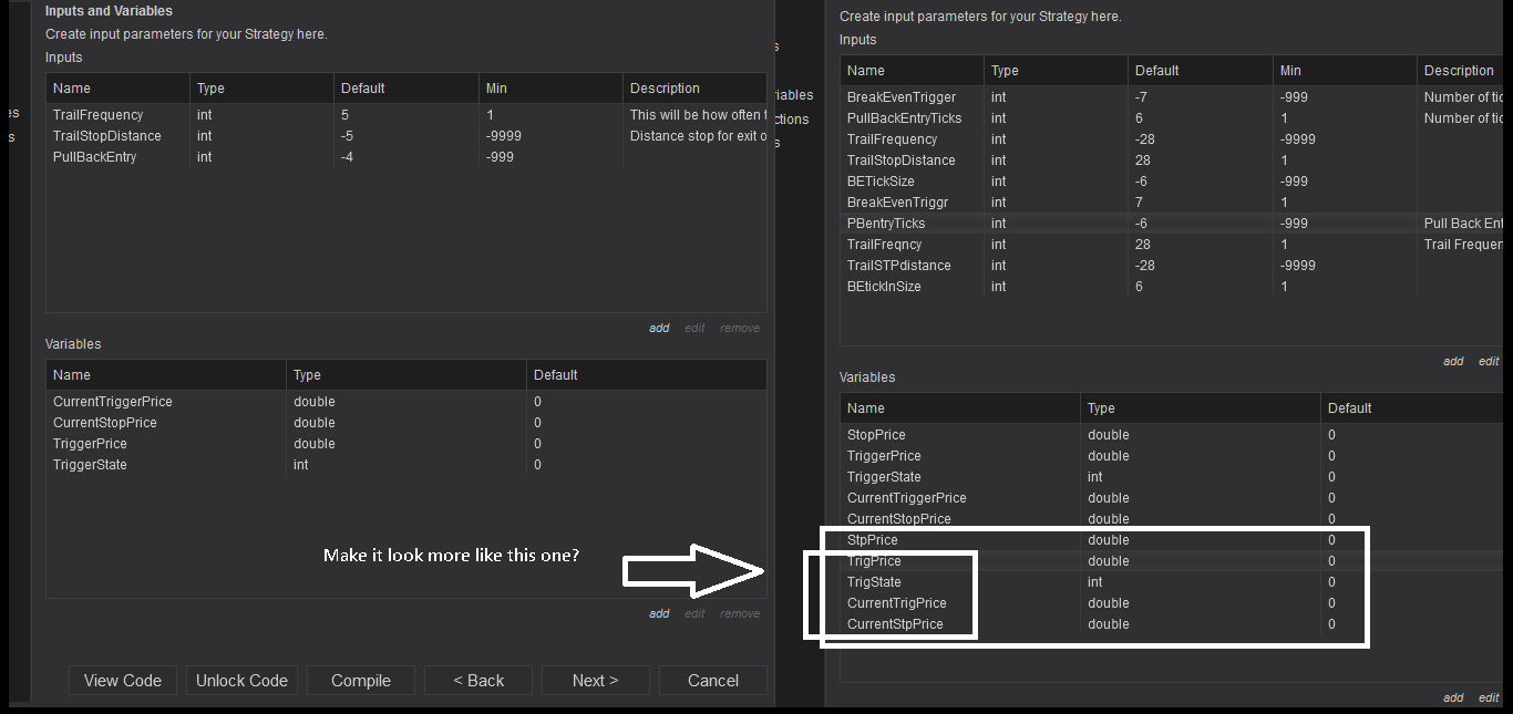 Because of the trailing stop and to have it trigger, I still need to keep those two variables, the current trigger price & current stop price, right? But add two more variables, like trigger price & trigger state? Like I have over in my other strategy where I'm using the trailing stop.