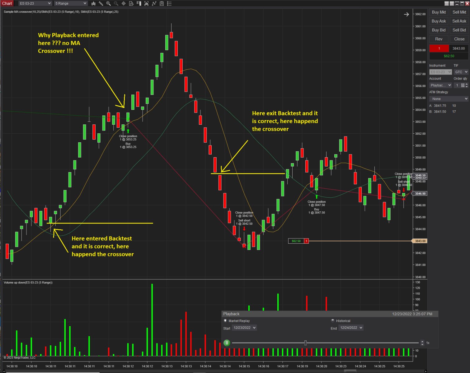 at the beginning I thought that it was due to intra bar data unrecognizing by backtester, but the entry is made correctly in both backtest and playback, and I have a fix 4 ticks TP and 4 tick SL, yet the backtester is mentionning the trade as a winning trade, while in playback mode, we lose, then when I go and check the 1 range chart, and 1 tick chart, both of them CLEARLY show that the price didn't even come near the TP level, so why backtester consider it as a winning trade ? isn't it the same data that backtest and playback are reading from ?