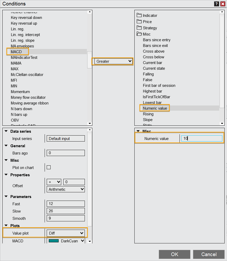 On the MACD, could you help with how to use the Strategy Builder to have it evaluate using the histogram along with the crossover of the fast/slow lines?