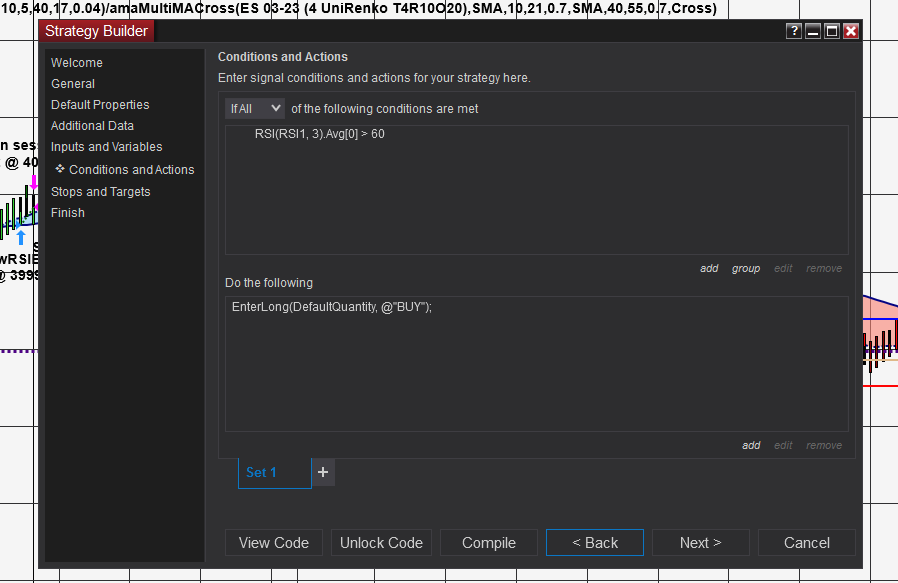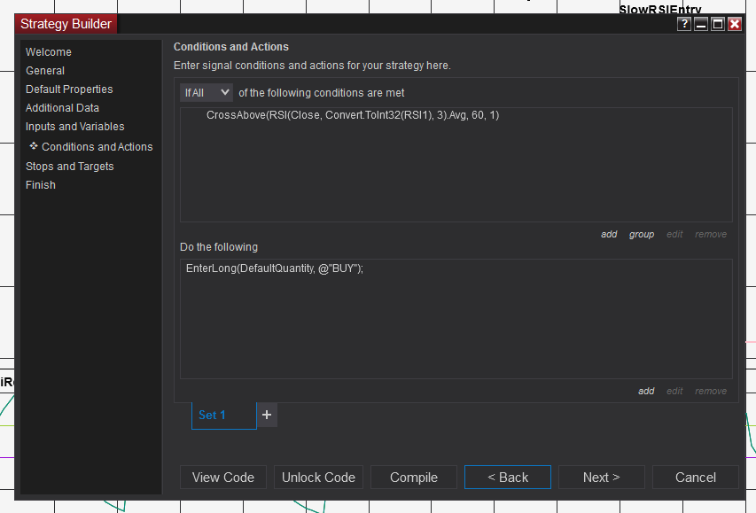 That worked. However, I want to use "user input" to change the values of the RSI. I labeled it "RSI1" in the Inputs and Variable section. When I removed it from Inputs and Variables, then it would compile. Not sure why it won't accept the user input. I do that all the time when creating strategies. Any ideas?