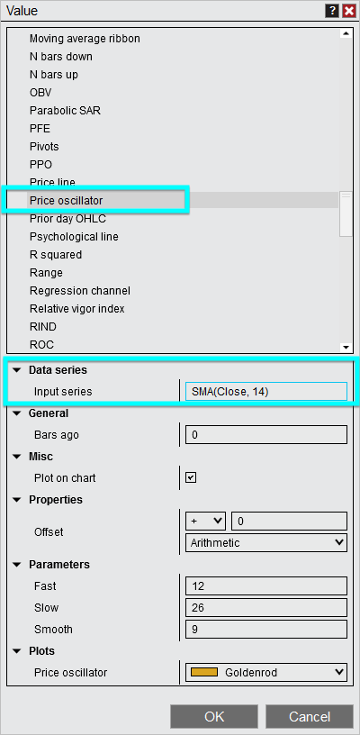 Please see the attached screenshots demonstrating how you could use the SMA indicator for the input series of an Oscillator, such as Price Oscillator.