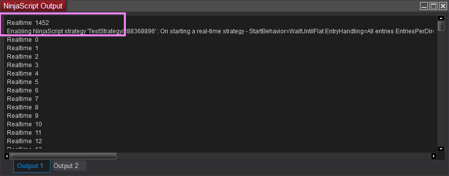 Also those outputs start only after price change on chart and not instantly when strategy added. After seeing actual current bar print, try to clear output window, wait until price changes and you'll see again Realtime 0 --> Realtime CurrentBar.